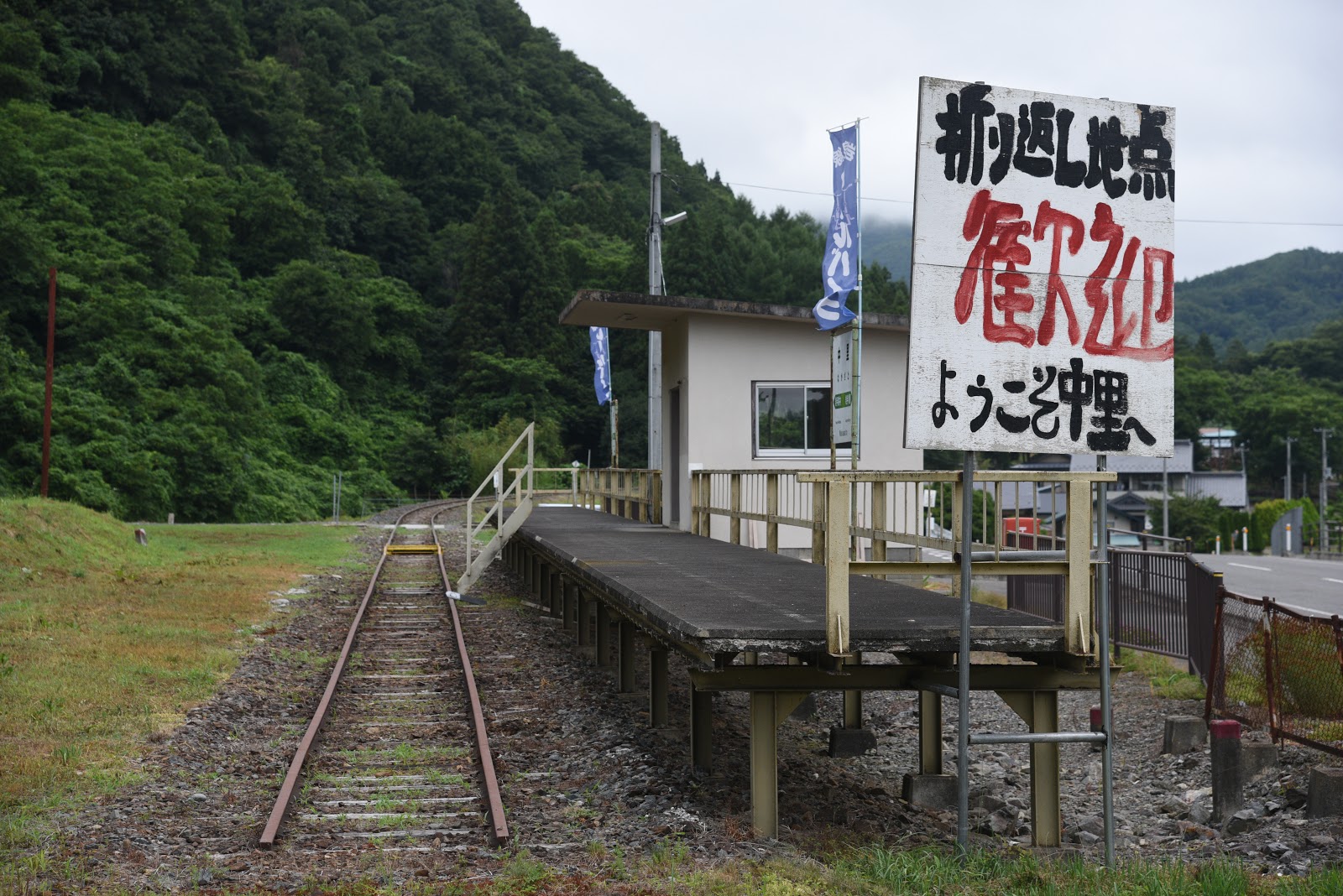 押角方面は廃線跡の風情。廃線時には1面1線のホームでしたが、かつては2本の側線と島式ホームがあったようです。